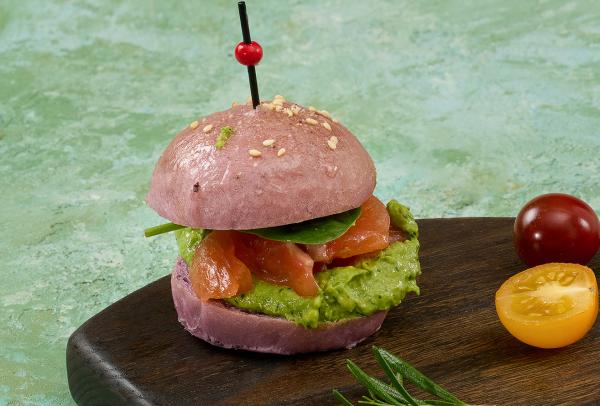Мини бургер с лососем и авокадо под соусом свит чилли